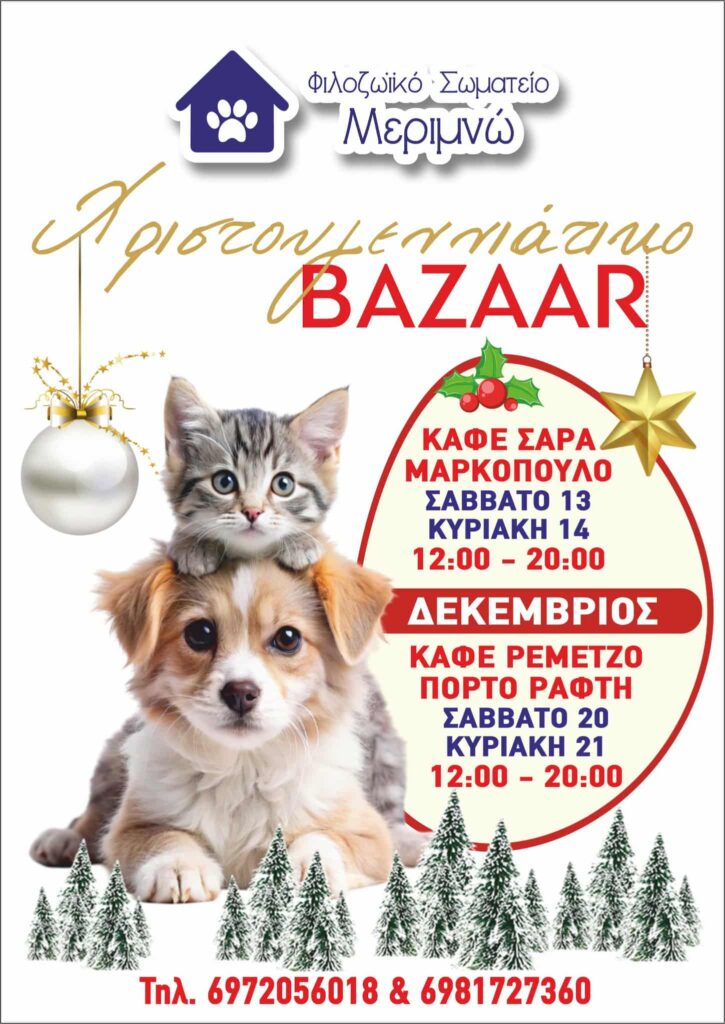 Το σωματείο Φιλοζωική Βοήθεια ” Μεριμνώ” μας προσκαλεί στο Θέατρο Σάρας Μαρκοπούλου, το Σάββατο 13 και την Κυριακή 14 Δεκεμβρίου, στο χριστουγεννιάτικο μπαζάρ του. Εκεί θα βρούμε χειροποίητα ρόδια, γούρια και πολλά δώρα για μικρούς και μεγάλους, η αγορά των οποίων βοηθάει τους εθελοντές να καλύψουν τις ανάγκες των αδέσποτων της πόλης μας.