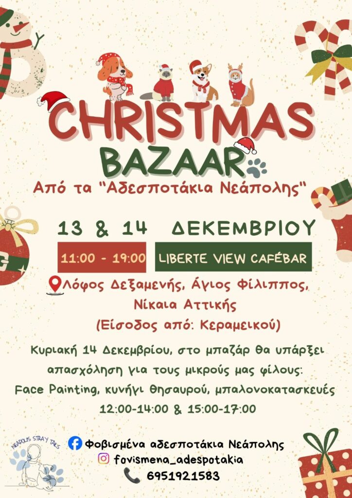 Στις 13 και 14 Δεκεμβρίου ο Φιλοζωικός Σύλλογος Νέας Φιλαδέλφειας μας προσκαλεί στο χριστουγεννιάτικο μπαζάρ του, στη Λεωφόρο Δεκελείας 152 (στο ΚΑΠΗ), από τις 10:30 έως τις 21:00. Εκεί θα βρούμε πολλά είδη δώρων, με την αγορά των οποίων στηρίζουμε το έργο του συλλόγου. Παράλληλα, θα διεξάγεται λαχειοφόρος αγορά που θα κρύβει πολλές εκπλήξεις. Όλα τα έσοδα θα διατεθούν για τις ανάγκες των ζώων που φροντίζουν οι εθελοντές.