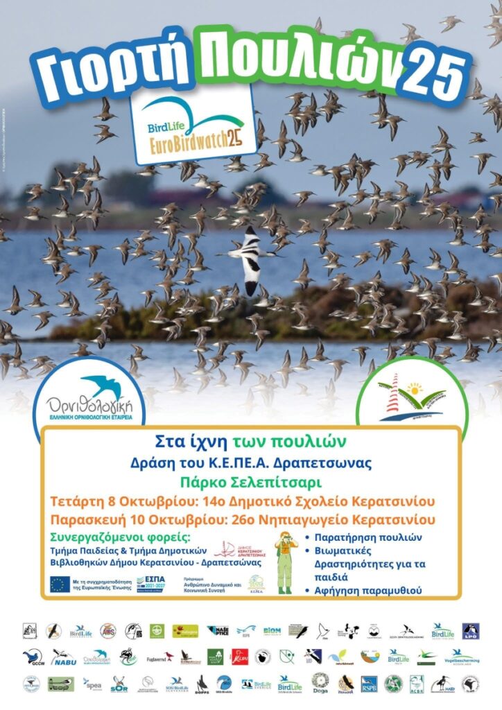 Από το 1987 και κάθε Οκτώβρη, η Ελληνική Ορνιθολογική Εταιρεία οργανώνει τη Γιορτή πουλιών, εκδήλωση που πλέον γίνεται σε διάφορες πόλεις της Ελλάδας. Η Γιορτή Πουλιών 2025 ξεκίνησε στις 4 και 5 Οκτωβρίου στη Βραυρώνα και συνεχίζεται με εκδηλώσεις όλο τον μήνα.