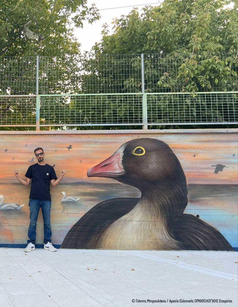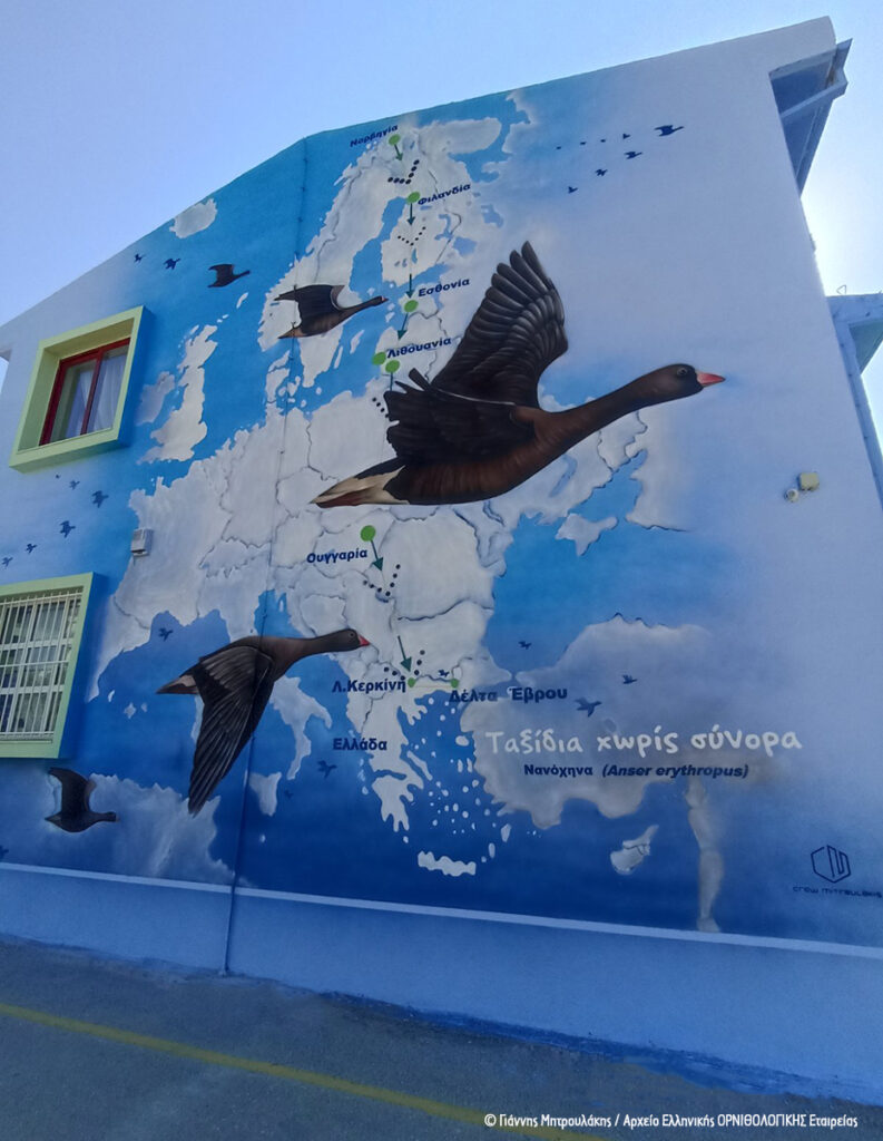 “Δύο εντυπωσιακές τοιχογραφίες με πρωταγωνίστρια τη Νανόχηνα, το πιο απειλούμενο υδρόβιο πουλί της Ευρώπης κοσμούν πλέον τους τοίχους των σχολείων της Αλεξανδρούπολης. Η δράση υλοποιήθηκε από την Ελληνική ΟΡΝΙΘΟΛΟΓΙΚΗ Εταιρεία, στο πλαίσιο του ευρωπαϊκού Προγράμματος LIFE LWfG CLIMATE για την προστασία της Νανόχηνας, με στόχο να φέρει τους μαθητές και την τοπική κοινωνία πιο κοντά στη σπάνια αυτή χήνα και να ενισχύσει την ευαισθητοποίηση για την προστασία τόσο της ίδιας όσο και των περιοχών που έχει ανάγκη για την επιβίωσή της.