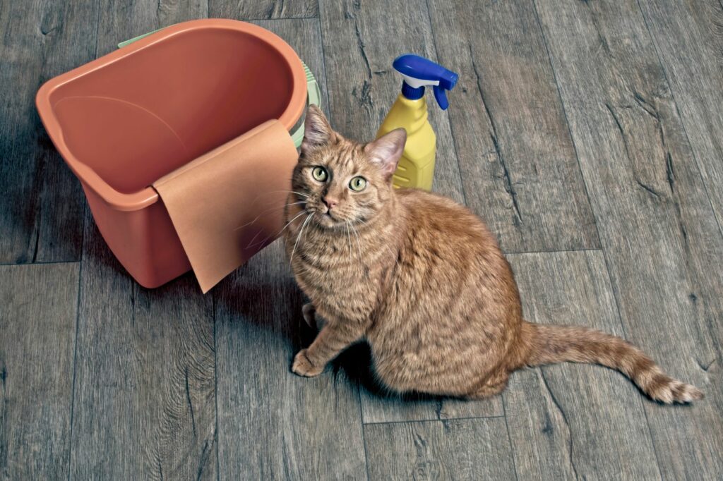 Οι ενζυματικοί καθαριστές για κατοικίδια είναι ιδιαίτερα αποτελεσματικοί, καθώς διασπούν τα οργανικά υπολείμματα και εξουδετερώνουν την οσμή. Αποφύγετε τη χρήση χλωρίνης, καθώς η μυρωδιά της μπορεί να προσελκύσει ξανά τη γάτα στο ίδιο σημείο.
