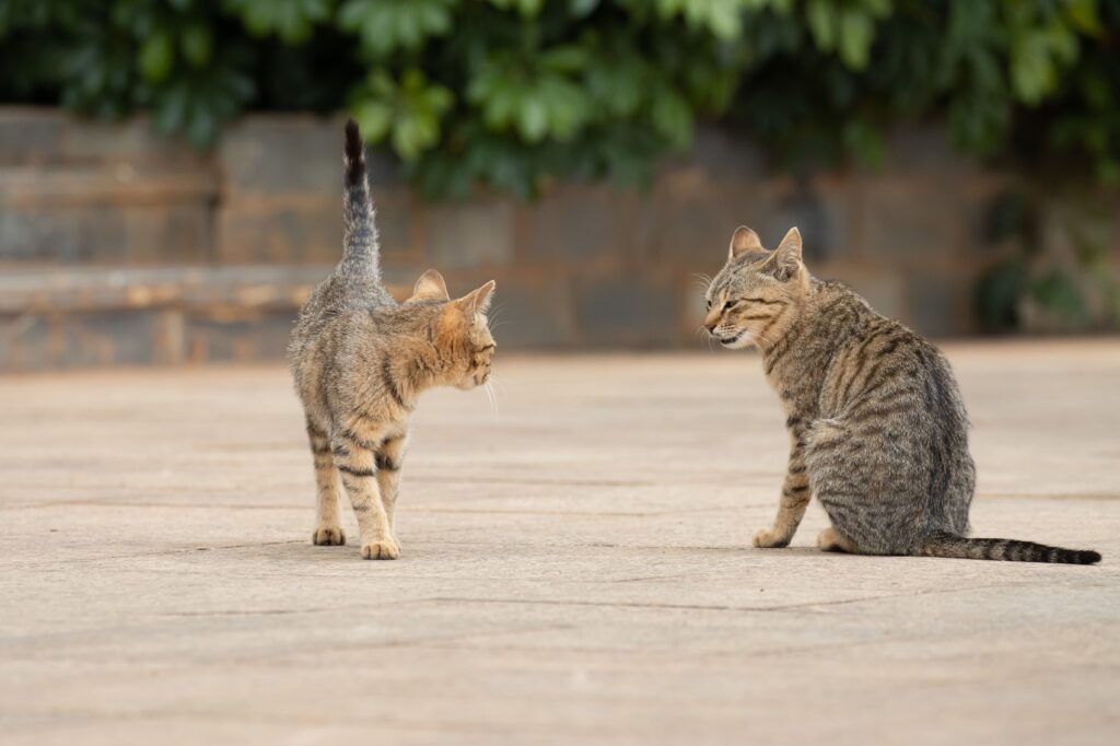 Όταν μια γάτα βρεθεί αντιμέτωπη με μια απειλή, μια άλλη γάτα ή έναν σκύλο, για παράδειγμα, συχνά προσπαθεί πρώτα να αποτρέψει αυτή την απειλή, όπως αναφέραμε και πιο πάνω, χωρίς μάχη. Το σφύριγμα, το γρύλισμα και η ”άγρια” στάση σώματος που παίρνουν εκείνη την ώρα οι γάτες έχουν στόχο να τρομάξουν τον αντίπαλο και να τον κάνουν να υποχωρήσει.