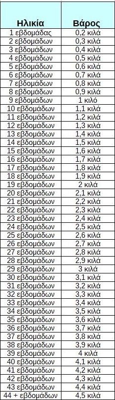 Ο πρώτος πίνακας αφορά το ιδανικό βάρος μιας γάτας αναλόγως την ηλικία της