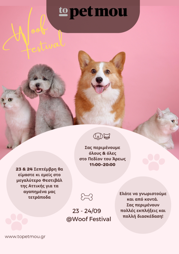 Όσοι έχετε κατοικίδιο και θέλετε να ενημερωθείτε για διάφορα θέματα ή όσοι θέλετε να υιοθετήσετε και αναζητάτε πληροφορίες ήρθε η μέρα σας. Το πρώτο Φεστιβάλ Φιλοζωίας, το Woof Festival, που θα γίνει Σάββατο 23 και Κυριακή 24 Σεπτεμβρίου, στο Πεδίον του Άρεως, είναι γεγονός. Μιλάμε για μια γιορτή που μικροί, μεγάλοι αλλά και οι τετράποδοι επισκέπτες θα περάσουν μοναδικές και αξέχαστες στιγμές με εκπλήξεις, πολλά δώρα, παιχνίδια και διαδραστικές εκδηλώσεις. Και δεν είναι μόνο αυτά.
