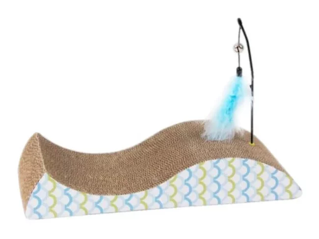 Ονυχοδρόμιο από χαρτόνι σε σχήμα ψαριού, για όλες τις γάτες. Έχει παιχνίδι με φτερό και καμπανάκι που θα διεγείρει την περιέργεια της γατούλας σας και θα την κρατήσει απασχολημένη.