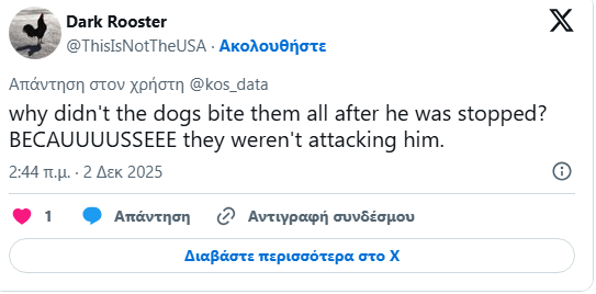 Από την άλλη πλευρά, χρήστες γράφουν πως οι σκύλοι δεν είχαν καμία πρόθεση να επιτεθούν και πως εξαγριώθηκαν από την συμπεριφορά του άνδρα, για αυτό το λόγο και δεν εκδήλωσαν επιθετικότητα απέναντι στη γυναίκα που προσπάθησε να τα υπερασπιστεί.