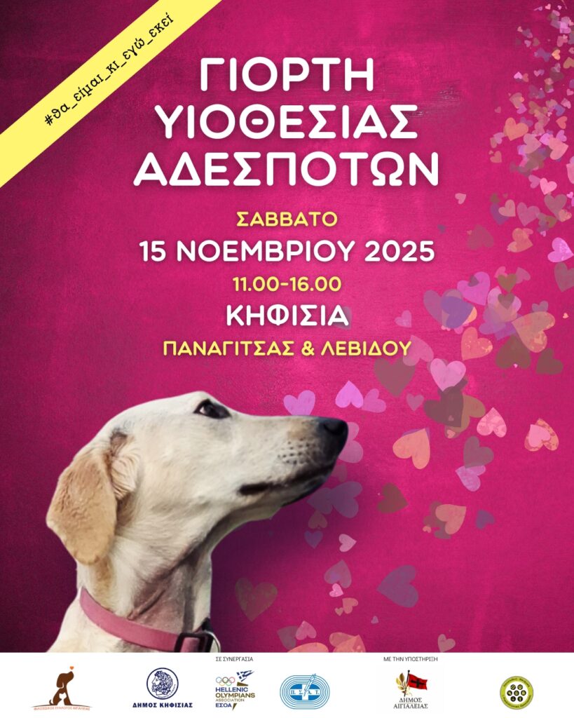 Με διάθεση να ενισχύσει τη φιλοζωία αλλά και την ευαισθητοποίησή μας προς τα αδέσποτα ζωάκια, ο Δήμος Κηφισιάς μας προσκαλεί στη Μεγάλη Γιορτή υιοθεσίας Αδέσποτων Ζώων το Σάββατο 15 Νοεμβρίου από τις 11:00 π.μ. έως τις 4:00 μ.μ. στο κέντρο της Κηφισιάς στη συμβολή οδών Παναγίτσας και Λεβίδου.