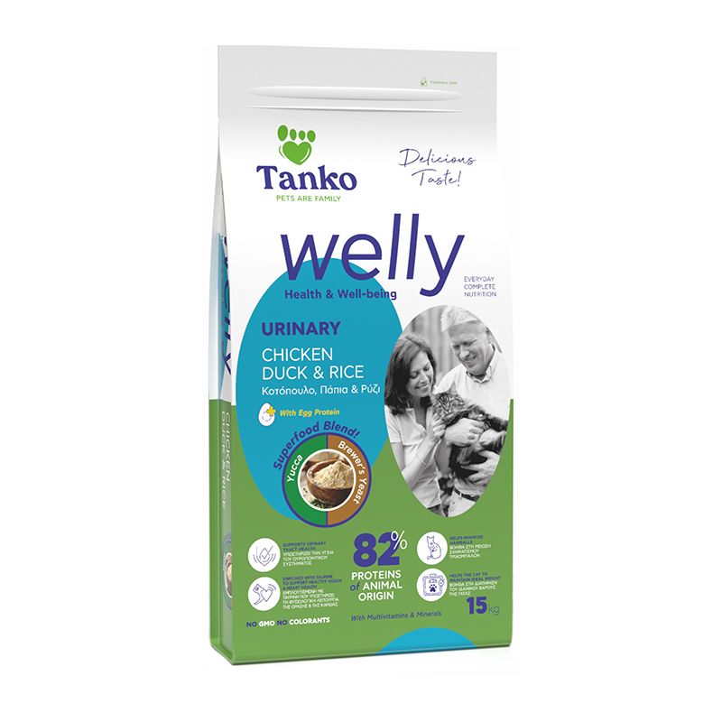 Όσο για τις γάτες που αντιμετωπίζουν προβλήματα με το ουροποιητικό, αλλά και γενικά τις αρσενικές στειρωμένες και τις ηλικιωμένες γάτες, που έχουν προδιάθεση γι’ αυτά, η Welly Urinary είναι η καταλληλότερη επιλογή. Με σύνθεση από κοτόπουλο, πάπια, ρύζι και υπερτροφές, με περιεκτικότητα 82% σε ζωικές πρωτεΐνες και περιορισμένες ποσότητες μαγνησίου και φωσφόρου, η συγκεκριμένη φόρμουλα συμβάλλει στη φυσιολογική λειτουργία του ουροποιητικού συστήματος, προλαμβάνοντας τα προβλήματα. Ταυτόχρονα, πρόκειται για μια γατοτροφή, η οποία βοηθά στην επίτευξη και διατήρηση του βέλτιστου βάρους.