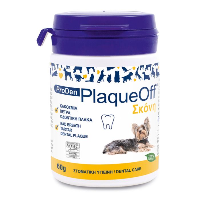 Η κακοσμία είναι μία ένδειξη ότι αντιμετωπίζει προβλήματα στοματικής υγιεινής. Η σκόνη αυτή είναι ένας εύκολος τρόπος για να βελτιώσετε τη στοματική υγιεινή του κατοικιδίου σας. Ιδανικό για την εξάλειψη της κακοσμίας καθώς και της υπάρχουσας πλάκας και της πέτρας. Είναι ένα απόλυτα φυσικό προϊόν που περιέχει ένα πατενταρισμένο είδος φυκιού, με αποδεδειγμένα οφέλη στη στοματική υγιεινή. Μπορεί να χρησιμοποιηθεί και προληπτικά. Το 85% των σκύλων και το 75% των γατών άνω των τριών ετών εμφανίζουν ουλίτιδα, η οποία προκαλεί πόνο στο στόμα και μπορεί να επιφέρει απώλεια δοντιών. Αποτελεί μια θεραπεία απαραίτητη για τη στοματική υγιεινή του σκύλου σας. Αν το κατοικίδιό σας υποφέρει από κακοσμία, η κύρια αιτία στο 80% των περιπτώσεων είναι η οδοντική πλάκα και πέτρα. Σε αντίθεση με άλλες μεθόδους ελέγχου της πλάκας, το Plaque Off δρα μέσω του αγγειακού συστήματος. Αποτρέπει την επικόλληση της πλάκας στα δόντια και μαλακώνει τα υπάρχοντα υπολείμματα πέτρας. Λόγω της υψηλής περιεκτικότητας σε ιώδιο φυκιού, το προϊόν μπορεί να μην είναι κατάλληλο σε ζώα που ακολουθούν θεραπεία υποθυρεοειδισμού. Πριν την χρήση του συμβουλευτείτε τον κτηνίατρο.