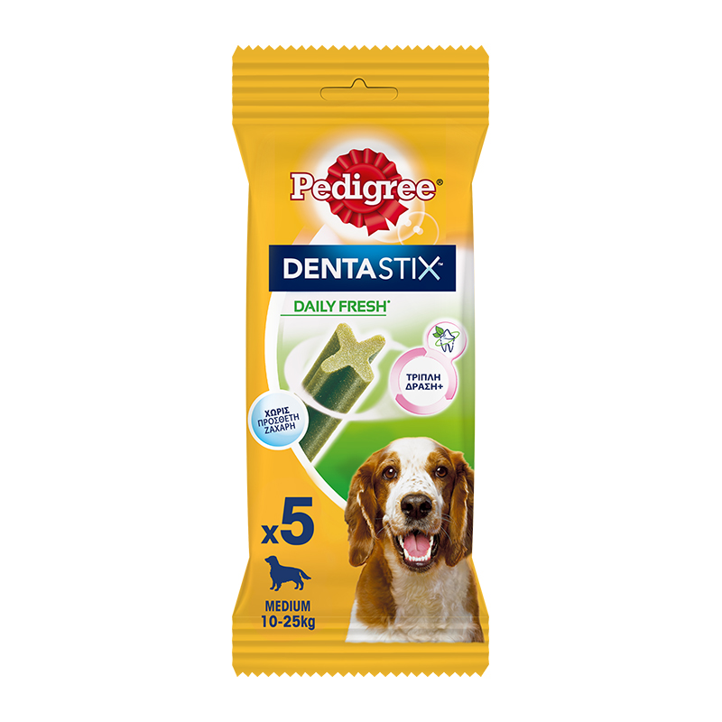 To Pedigree Dentastix Fresh έχει την ίδια δράση του Pedigree Dentastix και επιπλέον περιέχει έλαιο ευκάλυπτου και εκχύλισμα από πράσινο τσάι, που όχι μόνο καλύπτει τη δυσοσμία αλλά καταπολεμά και την αιτία της. Έτσι, φροντίζετε καθημερινά τα δόντια του σκύλου σας, και ταυτόχρονα καταπολεμάτε τη δυσάρεστη αναπνοή. Μπορείτε να του το προσφέρετε οποιαδήποτε στιγμή της ημέρας και ταιριάζει μοναδικά με την καθημερινή του διατροφή.