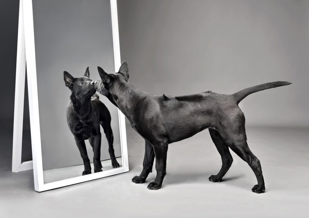 Σε αντίθεση με τους ανθρώπους και ορισμένα πρωτεύοντα θηλαστικά, οι σκύλοι βλέπουν την αντανάκλασή τους στον καθρέφτη αλλά δεν την αναγνωρίζουν ως τον εαυτό τους αλλά πιθανόν ως έναν άλλον κινούμενο σκύλο. Οι σκύλοι έχουν επίγνωση του εαυτού τους, απλώς με διαφορετικό τρόπο από εμάς και από άλλα ζώα. Αυτό που μπορούν να μυρίσουν είναι πολύ πιο σημαντικό για εκείνους από αυτό που μπορούν να δουν. Γι’ αυτό και η αντανάκλασή τους στον καθρέφτη δεν έχει μεγάλη σημασία για αυτούς.