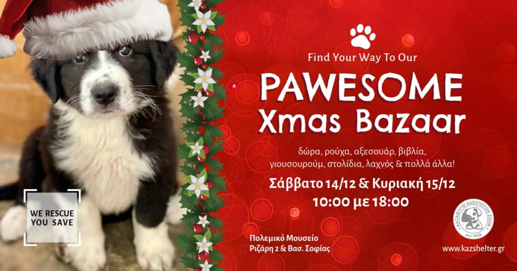 Σημειώστε την ημερομηνία. 14 και 15 Δεκεμβρίου έρχεται το χριστουγεννιάτικο παζάρι του συλλόγου KAZ Shelter For Stray Animals – Καταφύγιο Αδέσποτων Ζώων. Το παζάρι θα πραγματοποιηθεί στο Πολεμικό Μουσείο Αθηνών, Ριζάρη 2 και Βασ. Σοφίας, από τις 10 το πρωί μέχρι τις 6 το απόγευμα.