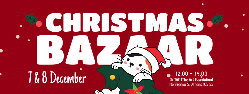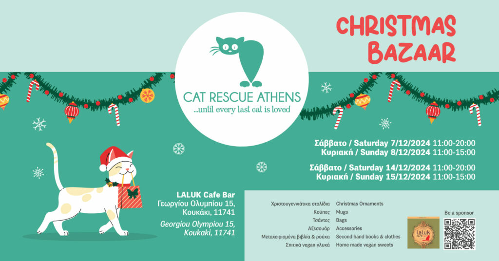 Οι εθελοντές της φιλοζωικής ομάδας Cat Rescue Athens σάς προσκαλούν στα δύο μπαζάρ που κάνουν στις 7 και 8 Δεκεμβρίου και στις 14 και 15 Δεκεμβρίου, στο LALUK Cafe Bar, Γεωργίου Ολυμπίου 15, Κουκάκι, από τις 11 το πρωί μέχρι τις 3 το μεσημέρι.