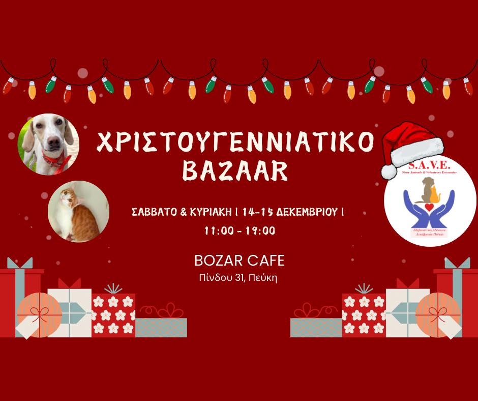 Το σωματείο SAVE Stray Animals and Volunteers, Εθελοντές και Αδέσποτα Λυκόβρυσης Πεύκης διοργανώνει το δικό του μπαζάρ στις 14 και 15 Δεκεμβρίου, στο BOZAR CAFE, Πίνδου 31, στην Πεύκη. Το μπαζάρ θα ξεκινήσει στις 11 το πρωί και θα τελειώσει στις 7 το απόγευμα.