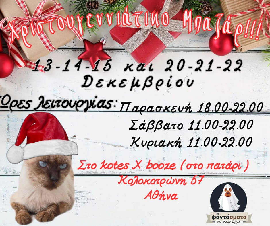Ανακαλύψτε μοναδικές ιδέες για χριστουγεννιάτικα δώρα, συναντήστε άλλους λάτρεις της γάτας και υποστηρίξτε το έργο των ακούραστων εθελοντών της ομάδας, οι οποίοι ανυπομονούν να σας γνωρίσουν και να σας μιλήσουν για όσα κάνουν αλλά και για τα ζωάκια που ψάχνουν σπίτι.