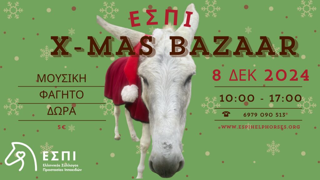 Επισκεφτείτε το μπαζάρ του συλλόγου και περάστε μια όμορφη, χριστουγεννιάτικη μέρα. Βοηθήστε τους ανθρώπους του ΕΣΠΙ να συνεχίσουν να στηρίζουν τα ιπποειδή που έχουν ανάγκη. Η βοήθειά σας είναι πιο πολύτιμη από ποτέ και κάθε συμμετοχή σας κάνει τη διαφορά.