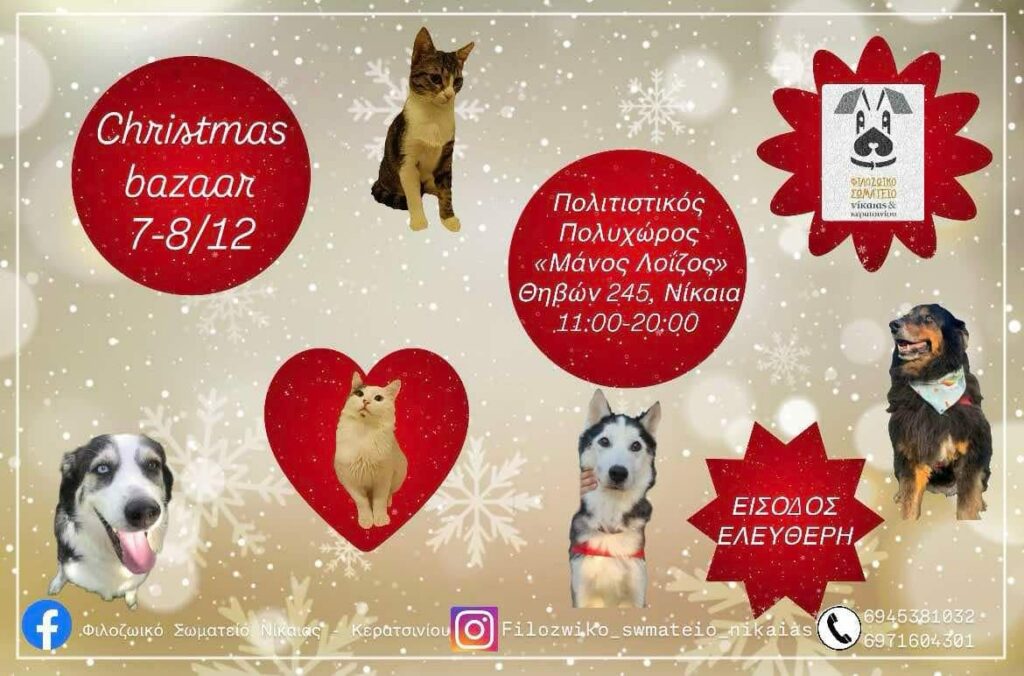 Οι εθελοντές του Φιλοζωικού Σωματείου Νίκαιας-Κερατσινίου σας προσκαλούν στις 7 και 8 Δεκεμβρίου στο χριστουγεννιάτικο παζάρι τους, στον Πολιτιστικό Πολυχώρο ”Μάνος Λοίζος”, Θηβών 245, στη Νίκαια. Το μπαζάρ θα ξεκινήσει στις 11 το πρωί και θα τελειώσει στις 8 το βράδυ. Παρόντες θα είναι και κάποιοι από τους υπέροχους σκύλους που φροντίζει η ομάδα και αναζητούν σπίτι.