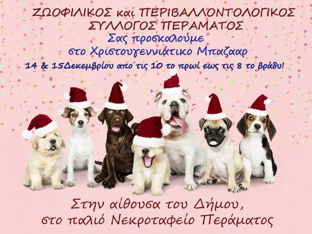 Το χριστουγεννιάτικο μπαζάρ του ΖΩΟΦΙΛΙΚΟΥ ΚΑΙ ΠΕΡΙΒΑΛΛΟΝΤΟΛΟΓΙΚΟΥ ΣΥΛΛΟΓΟΥ ΠΕΡΑΜΑΤΟΣ θα πραγματοποιηθεί στις 14 και 15 Δεκεμβρίου, στην αίθουσα του Δήμου, στο παλιό νεκροταφείο Περάματος, από τις 10 το πρωί έως τις 8 το βράδυ. Εκεί θα βρείτε το όμορφο ημερολόγιο του συλλόγου για το 2025, πολλά χριστουγεννιάτικα είδη, βιβλία, αξεσουάρ για τους αγαπημένους μας φίλους και πολλά άλλα.