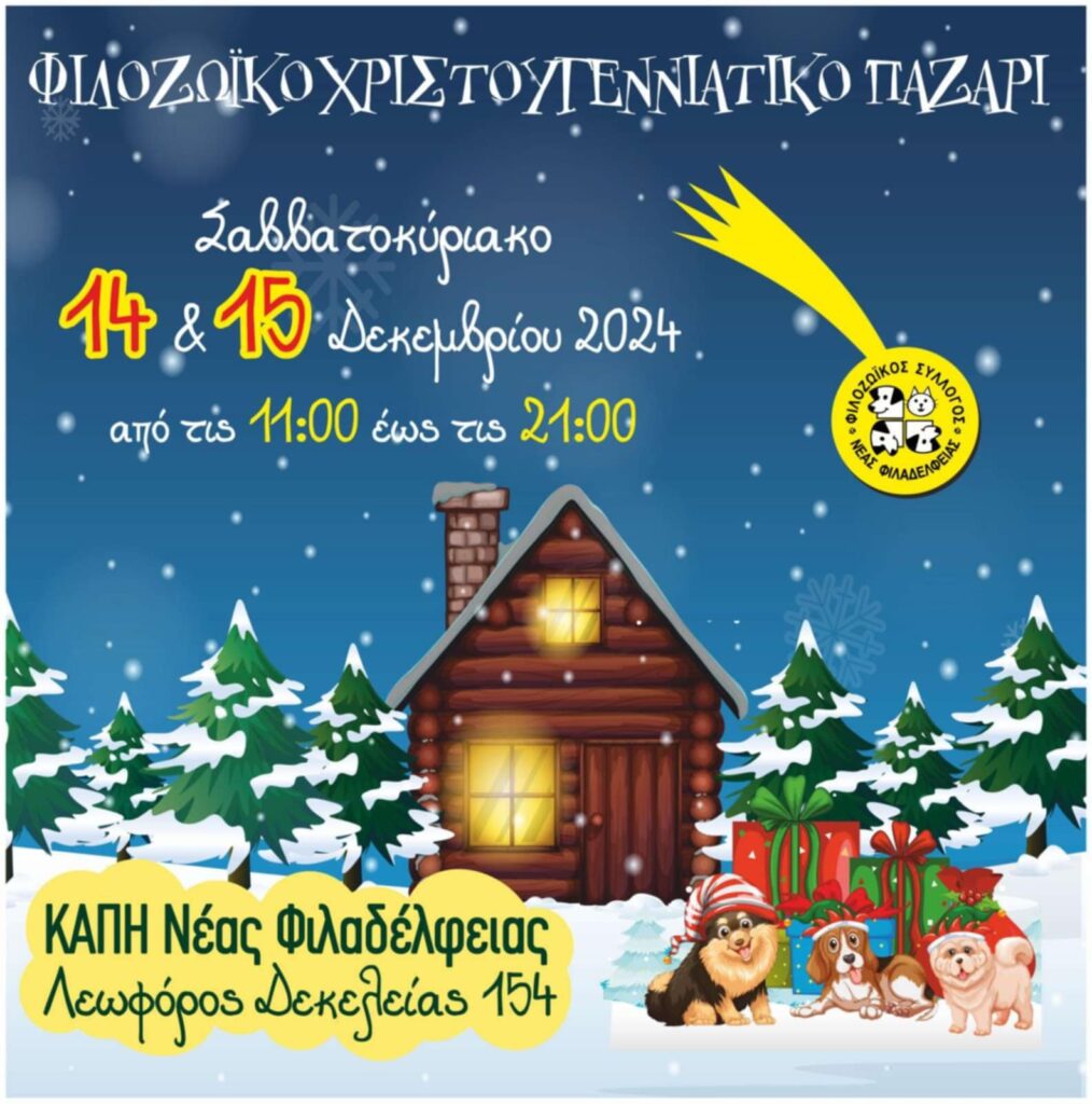 Ο Φιλoζωικός Ν. Φιλαδέλφειας σας περιμένει με χαρά να κάνετε τα χριστουγεννιάτικα ψώνια σας το Σαββατοκύριακο 14 και 15 Δεκεμβρίου, από τις 11 το πρωί μέχρι τις 9 το βράδυ, στο ΚΑΠΗ Νέας Φιλαδέλφειας, στη Λεωφόρο Δεκελείας 154. Όλα τα έσοδα θα διατεθούν για την ιατρική περίθαλψη, την τροφή και την ευζωία των πολλών αδέσποτων που φροντίζει ο σύλλογος.