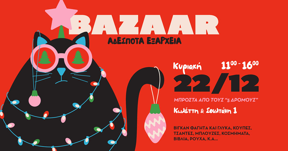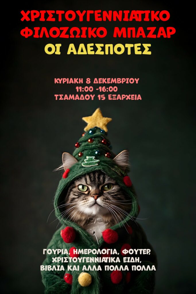 Η φιλοζωική ομάδα ΟΙ ΑΔΕΣΠΟΤΕΣ διοργανώνει το χριστουγεννιάτικο παζάρι της την Κυριακή 8 Δεκεμβρίου, στο κτίριο της Τσαμαδού 15 στα Εξάρχεια, από τις 11:00 έως τις 16:00. Εκεί θα βρείτε υπέροχα χριστουγεννιάτικα είδη, φούτερ, ημερολόγια, βιβλία, πατάκια χριστουγεννιάτικα με γατούλες, κάλτσες και άλλα πολλά.