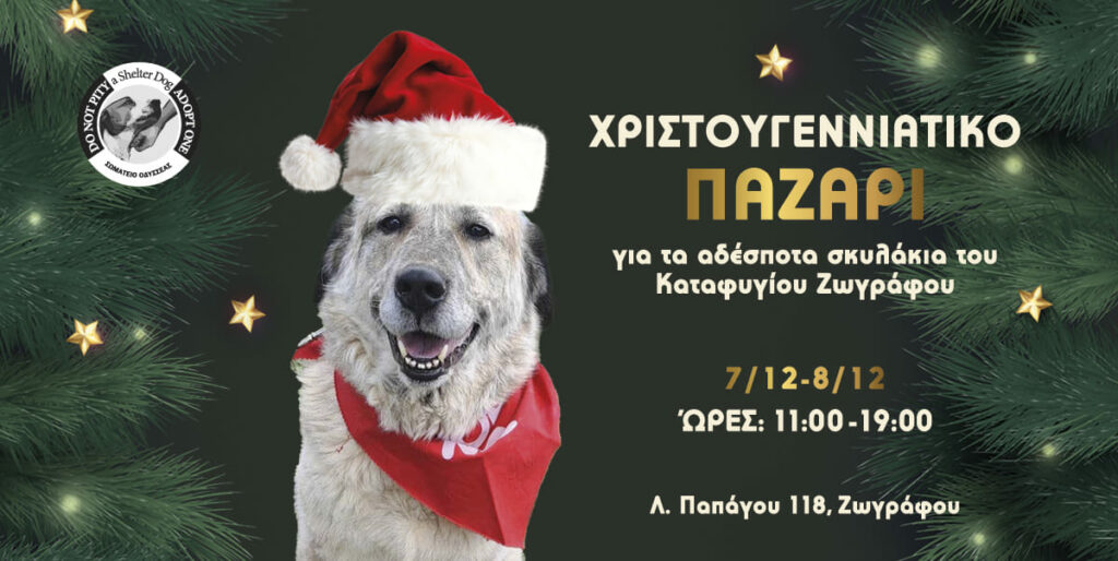 Το Φιλοζωικό Σωματείο Οδυσσέας – Animals Protection Odysseas που δραστηριοποιείται στην περιοχή του Ζωγράφου ετοιμάζει το χριστουγεννιάτικο μπαζάρ του για τα αδέσποτα σκυλάκια του καταφυγίου Ζωγράφου, το οποίο θα γίνει στις 7 και 8 Δεκεμβρίου, στη Λ. Παπάγου 118, Ζωγράφου. Οι ώρες του μπαζάρ είναι από τις 11 το πρωί μέχρι τις 7 το απόγευμα.