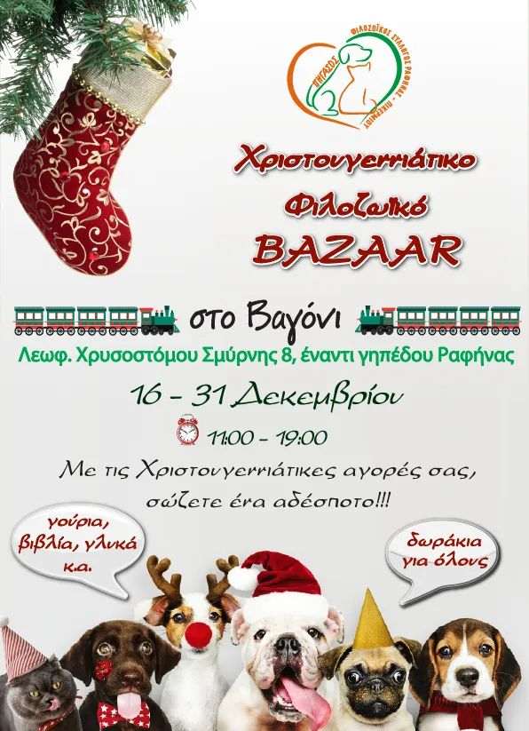 Οι εθελοντές του φιλοζωικού συλλόγου Πήγασος Φιλοζωική Ραφήνας Πικερμίου σας προσκαλούν στο ετήσιο χριστουγεννιάτικο παζάρι τους που θα πραγματοποιηθεί από τις 16 μέχρι τις 31 Δεκεμβρίου, από τις 11 το πρωί μέχρι τις 7 το απόγευμα, στο Βαγόνι, Λεωφ. Χρυσοστόμου Σμύρνης 8, έναντι γηπέδου Ραφήνας.