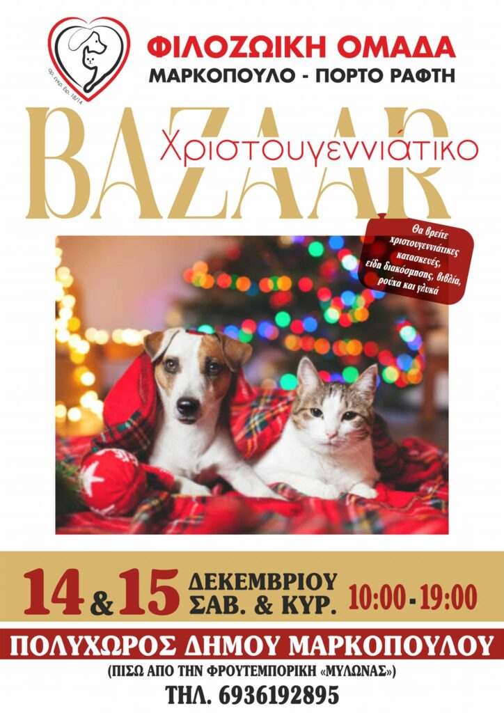 Η Φιλοζωική Ομάδα Μαρκόπουλο Πόρτο Ράφτη – Filozoiki Markopoulo Porto Rafti διοργανώνει το χριστουγεννιάτικο μπαζάρ της και σας περιμένει όλους. Το μπαζάρ θα γίνει στις 14 και 15 Δεκεμβρίου, από τις 10 το πρωί μέχρι τις 7 το απόγευμα, στον Πολυχώρο Δήμου Μαρκοπούλου.