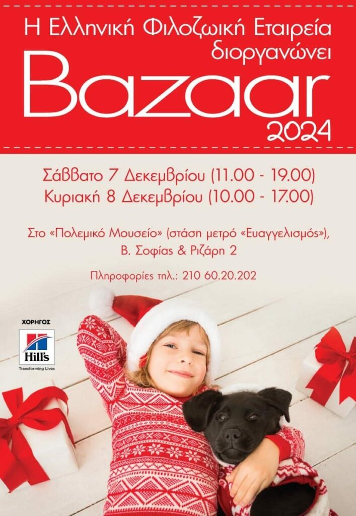 Στον πανέμορφο και σύγχρονο χώρο του Φουαγιέ του Πολεμικού Μουσείου Αθήνας, Ριζάρη 2-4, θα πραγματοποιηθεί στις 7 και 8 Δεκεμβρίου το ετήσιο μπαζάρ που διοργανώνει η Ελληνική Φιλοζωική Εταιρεία.