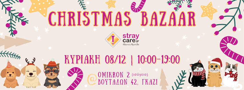 Ένα επίσης μπαζάρ που δεν πρέπει να χάσετε είναι αυτό της εθελοντικής ομάδας StrayCare.gr Αδέσποτη Φροντίδα. Το μπαζάρ θα πραγματοποιηθεί την Κυριακή 8 Δεκεμβρίου, από τις 10 το πρωί μέχρι τις 7 το απόγευμα, στο OMIKRON 2, Βουτάδων 42, Γκάζι.
